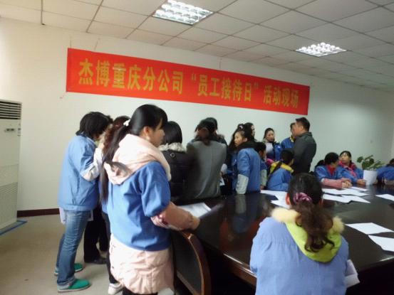 為更好的傾聽(tīng)員工心聲,切實(shí)幫助員工解決工作上存在的困惑、生活上遇到的問(wèn)題,本著(zhù)“關(guān)心工作、關(guān)心生活、關(guān)心成長(cháng)”的杰博服務(wù)文化,“為客戶(hù)服務(wù)的心,永無(wú)止境;為員工服務(wù)的心,永無(wú)止境”的服務(wù)宗旨, 致力于成為中國人力資源服務(wù)行業(yè)“員工服務(wù)效率”和“員工滿(mǎn)意度”最高的人力資源服務(wù)機構的服務(wù)目標,2011年12月23日我司聯(lián)合客戶(hù)單位舉辦了杰博重慶分公司“員工接待日”活動(dòng)。